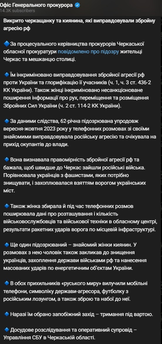 Прокуратура сообщила о подозрении двум гражданам Украины за оправдание агрессии РФ в разговорах по телефону и распространение данных о расположении ВСУ.