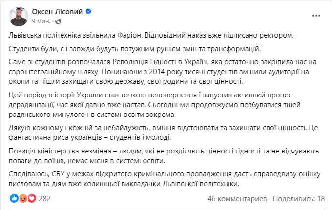 "Львовская политехника уволила Фарион. Соответствующий приказ уже подписан ректором", – написал чиновник в Фейсбуке.