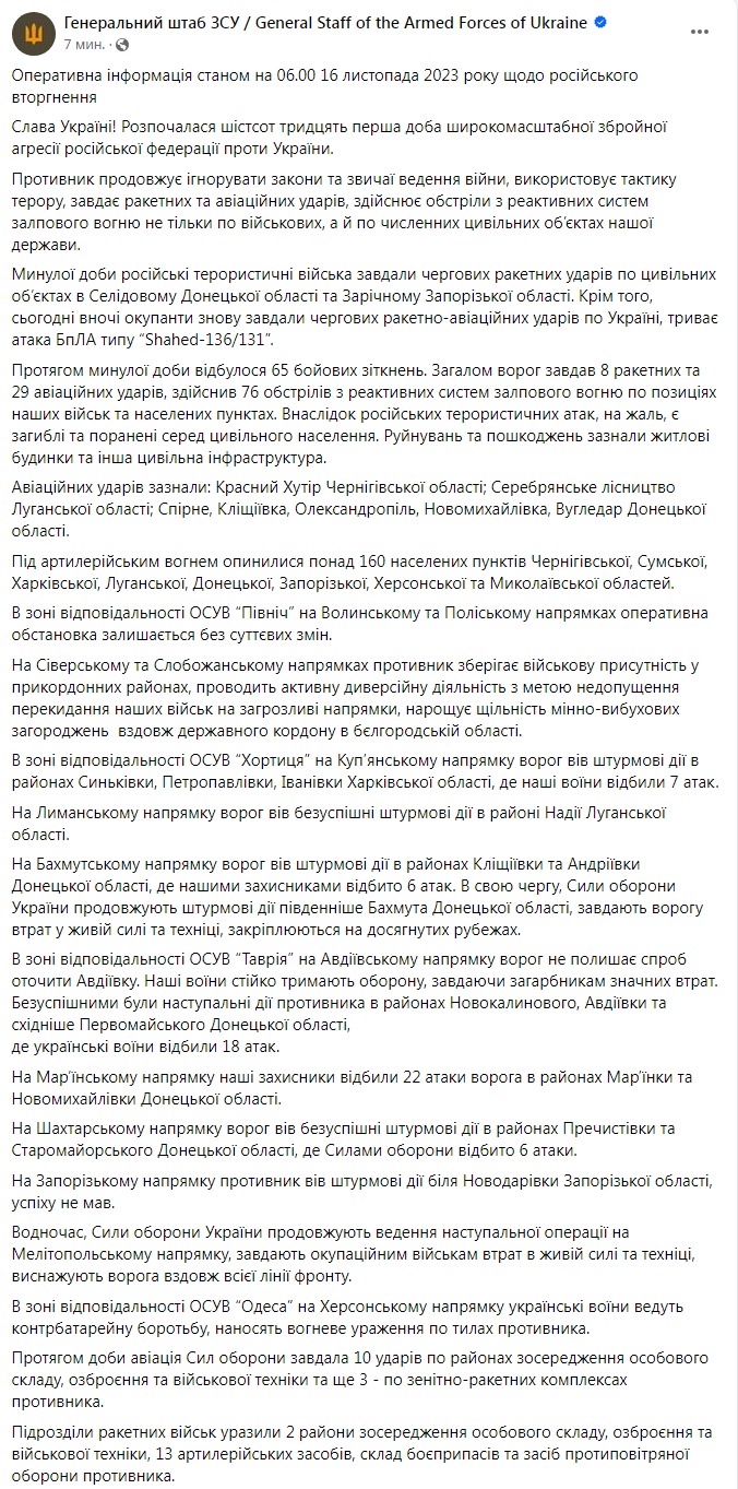 Вечерняя сводка Генштаба ВСУ 16 ноября 2023 года