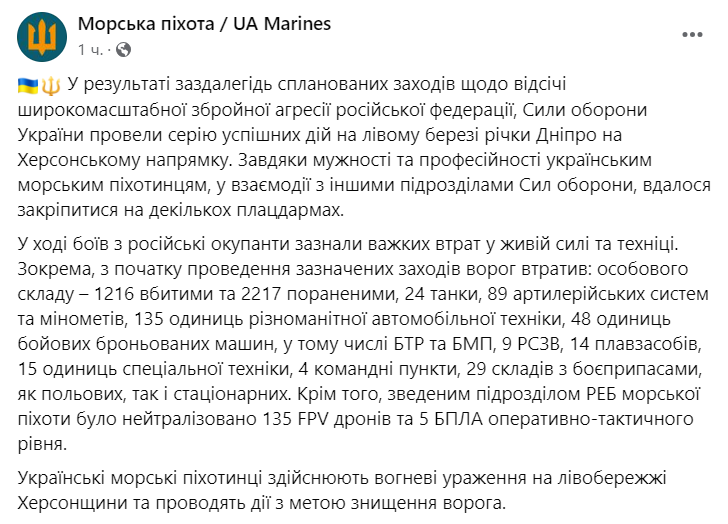 Морская пехота сообщила, что им удалось закрепиться на нескольких плацдармах на левом берегу Днепра