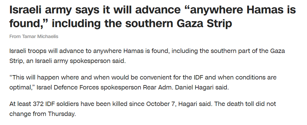 По словам Хагари, с 7 октября было убито по меньшей мере 372 солдата ЦАХАЛа.
