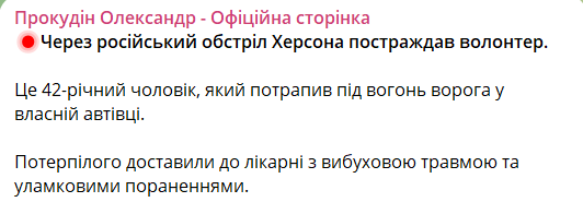 В Херсоне в результате очередных российских обстрелов пострадал волонтер. Об этом сообщил глава Херсонской ОВА Александр Прокудин.