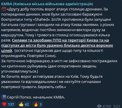"Вторые сутки подряд враг атакует столицу дронами. По предварительным данным, снова были применены баражирующие боеприпасы типа "Shahed". БПЛА противника были запущены многими группами и заходили на атаку Киева волнами по разным направлениям, одновременно постоянно меняя векторы движения по маршруту. Потому и тревога в столице объявлялась несколько раз. Силами и средствами ПВО на территории Киева и на подступах к городу было поражено около десятка враждебных целей", - сообщил глава КГВА Сергей Попко.