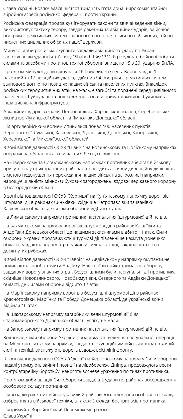 07:20 За прошедшие сутки произошло 46 боевых столкновений. Россияне нанесли 1 ракетный и 17 авиационных ударов, совершили 94 обстрела из реактивных систем залпового огня по позициям наших войск и населенным пунктам.