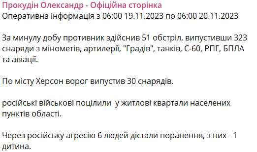 07:48 За минувшие сутки россияне 51 раз обстреляли Херсонскую область, выпустив 323 снаряда из минометов, артиллерии, "Градов", танков, С-60, РПГ, БПЛА и авиации. По городу Херсон враг выпустил 30 снарядов.