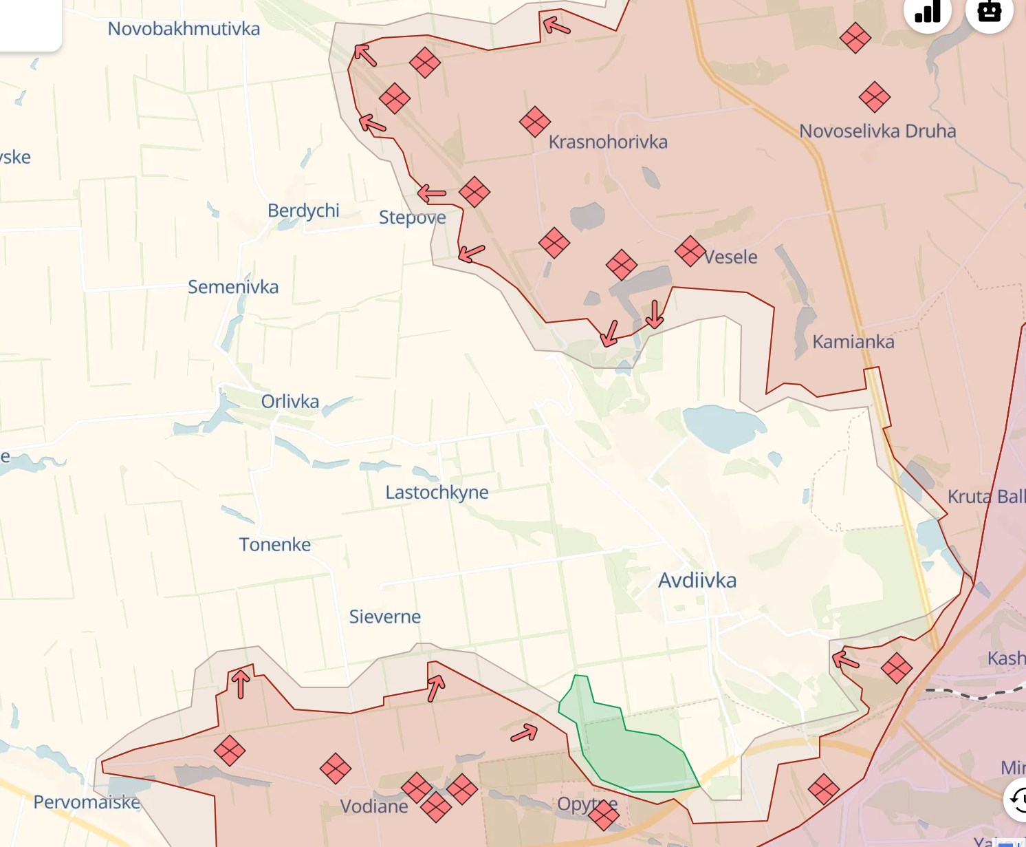 Под Авдеевкой активность россиян переместилась со Степного в район коксохимзавода и дач к юго-востоку от города. Как пишет военный паблик Deep State, также усилились атаки на Первомайское, к югу от Авдеевки, где "враг наступает регулярно и во многих местах".