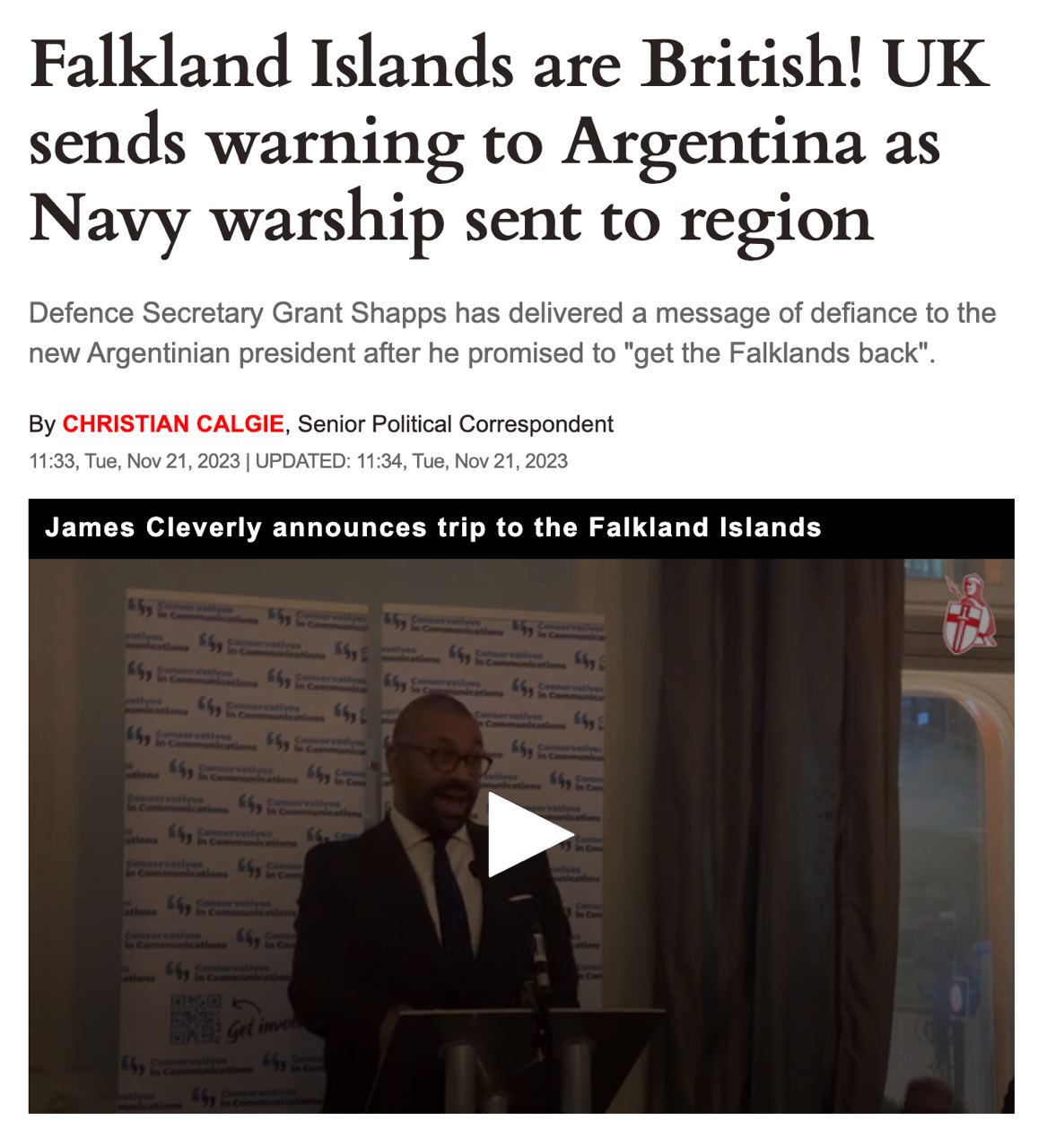 Великобритания заявила новоизбранному президенту Аргентины Хавьеру Милею, что не будет обсуждать принадлежность Фолклендских островов, суверенитет над которыми оспаривают Аргентина и Соединенное Королевство.