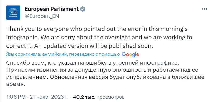 "Спасибо всем, кто указал на ошибку в утренней инфографике. Приносим извинения за допущенную оплошность и работаем над ее исправлением", – написала пресс-служба Европарламента.