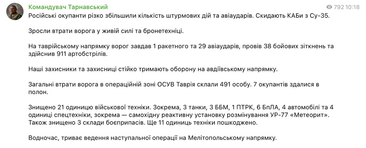 Военные РФ увеличили количество штурмовых действий и авиационных ударов на таврическом направлении (Запорожская область и юг Донецкой). Сбрасывают управляемые авиационные бомбы из Су-35.
