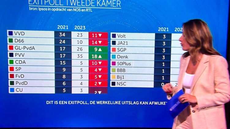 Тогда данные экзит-полла по заказу нидерландской национальной телерадиовещательной компании NOS, показали, что умеренно правая Народная партия за свободу и демократию (VVD) во главе с Рютте получит 31 из 150 мест в будущем парламенте против 19 у Партии свободы (PVV) Вилдерса.