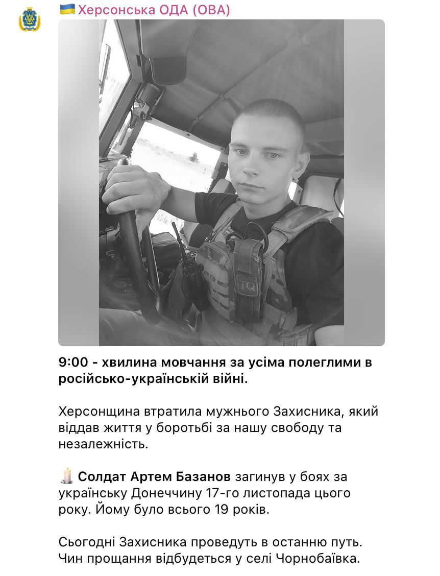 Отметим, что на канале Херсонской ОВА сегодня появилось сообщение, что сегодня в Чернобаевке будут хоронить 19-летнего военного. Время указано не было.
