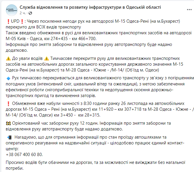 После стало известно, что трассу М-15 Одесса-Рени полностью перекрыли для всех видов транспорта. Также введены ограничения в движении для грузовиков на автодороге М-05 Киев - Одесса.