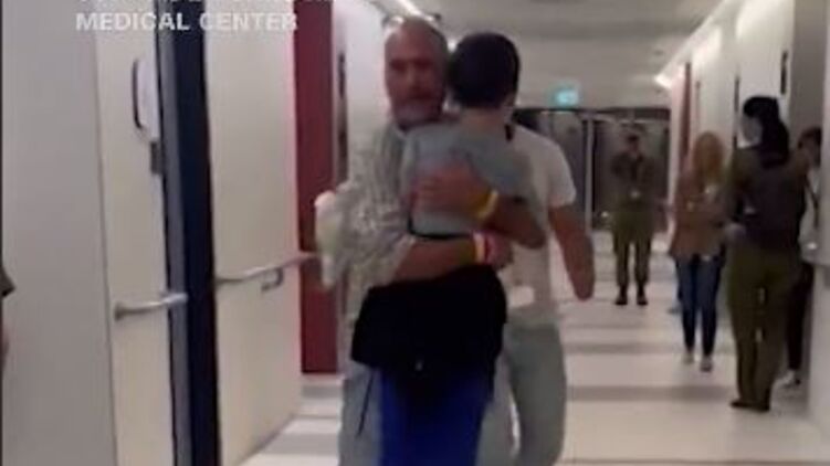 На кадрах видно, как в детской больнице девятилетний мальчик бежит навстречу к своему отцу. Видны также пожилые женщины, которые тоже были в заложниках у боевиков ХАМАС.