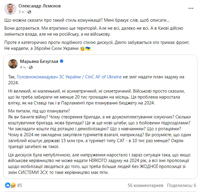 Однако я категорически против подобного стиля дискуссии. Некоторые забывают, кто держит фронт. Не нардепы, а Вооруженные силы Украины", - написал Леменов, комментируя пост Безуглой.