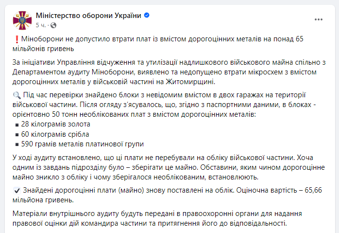 В Житомирской области на территории одной из воинских частей найдены драгоценные металлы более чем на 65 млн гривен, которые не стояли на учете.