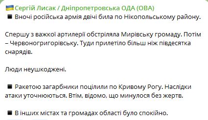 07.35 Ночью армия РФ дважды била по Никопольскому району Днепропетровской области.