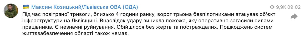 "Во время воздушной тревоги, около 4 часов утра, враг тремя беспилотниками атаковал объект инфраструктуры во Львовской области. В результате удара возник пожар, который оперативно потушили силами работников. Имеются незначительные разрушения", - написал он.
