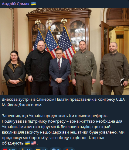"Заверил, что Украина продолжит идти по пути реформ. Поблагодарил за поддержку Конгресса – она жизненно необходима для Украины, и мы высоко ценим ее. Выразил надежду, что крайне важные для защиты нашего государства инициативы будут приняты. Мы продолжаем борьбу за свободу и ценности, объединяющие нас", - написал глава ОП.