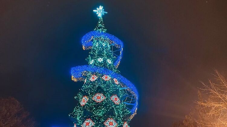 Елка украшена элементами традиционного украинского орнамента и сине-желтой лентой.