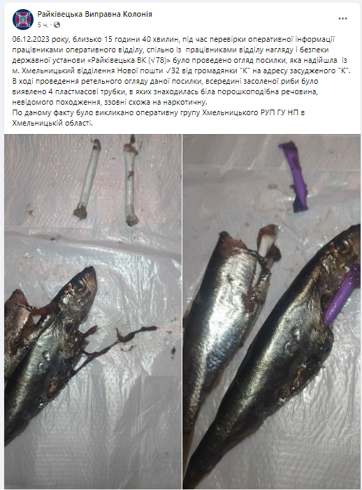 Персонал Райковецкой исправительной колонии в Хмельницкой области обнаружил наркотики в посылке, которая была отправлена одному из заключенных. Наркотики были спрятаны в двух засоленных рыбах, которые были отправлены заключенному.