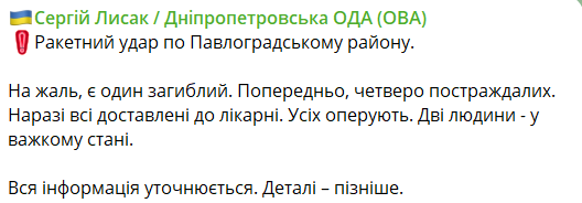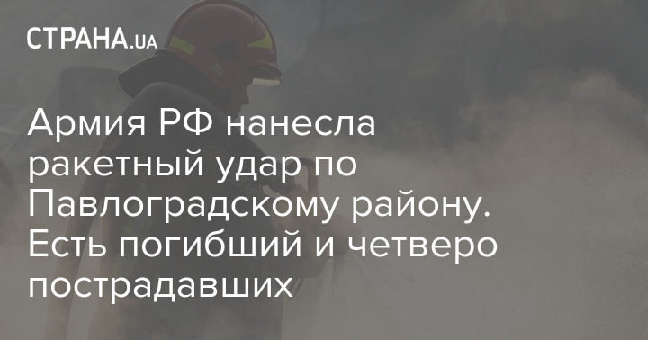 Сегодня утром российская армия нанесла ракетный удар по Павлоградскому району. Есть погибший и предварительно четверо пострадавших.
