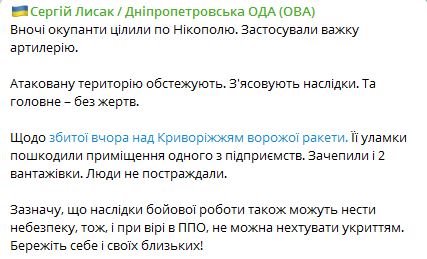 08.10 Обломки сбитой вчера над Кривым Рогом ракеты повредили одно из предприятий.