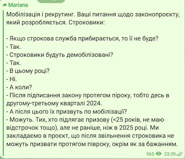 - Демобилизация нынешних срочников, но не раньше апреля 2024 года (после подписания закона).