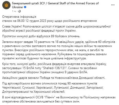 Утром 12 декабря Генштаб ВСУ обнародовал сводку о ситуации на фронте за минувшие сутки.