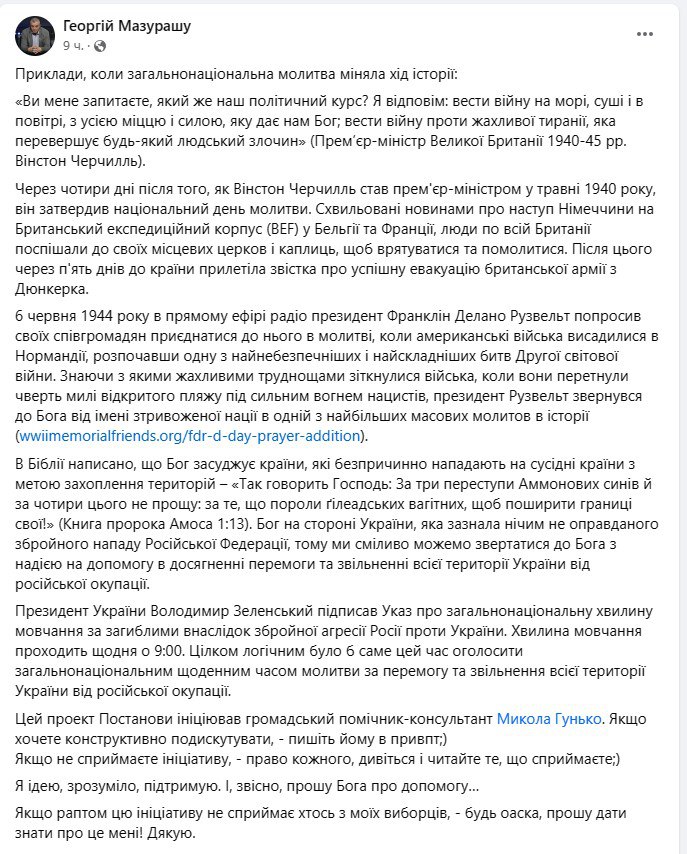 Народный депутат от "Слуги народа" Георгий Мазурашу предлагает узаконить ежедневную молитву за победу ВСУ и освобождение всей территории Украины.