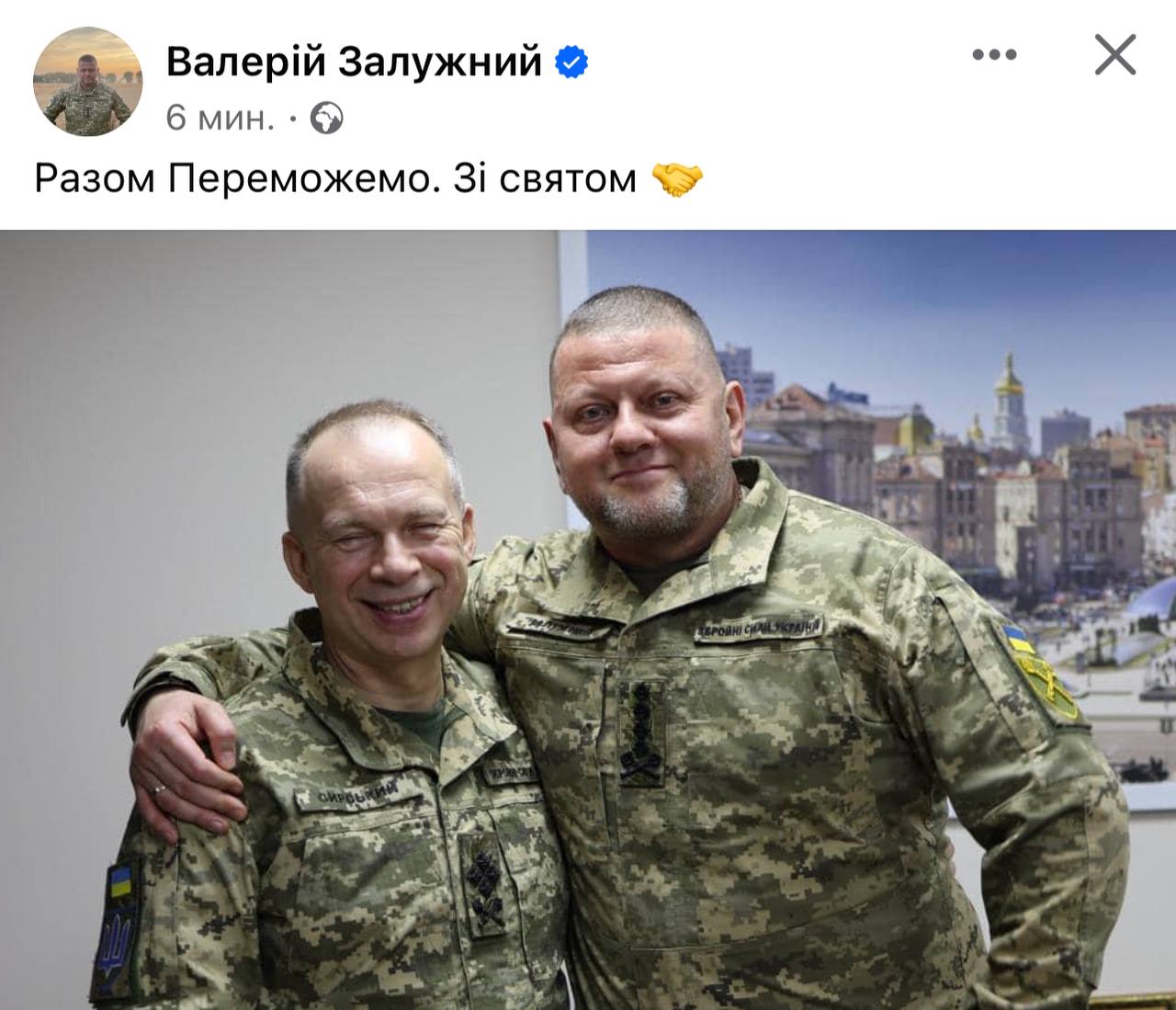 "Вместе победим. С праздником", — подписал фото Залужный, имея в виду день Сухопутных войск Украины.