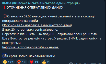 Уточненая информая от начальника КГГА Сергея Попко по пострадавшим в результате ночной атаки на столицу.