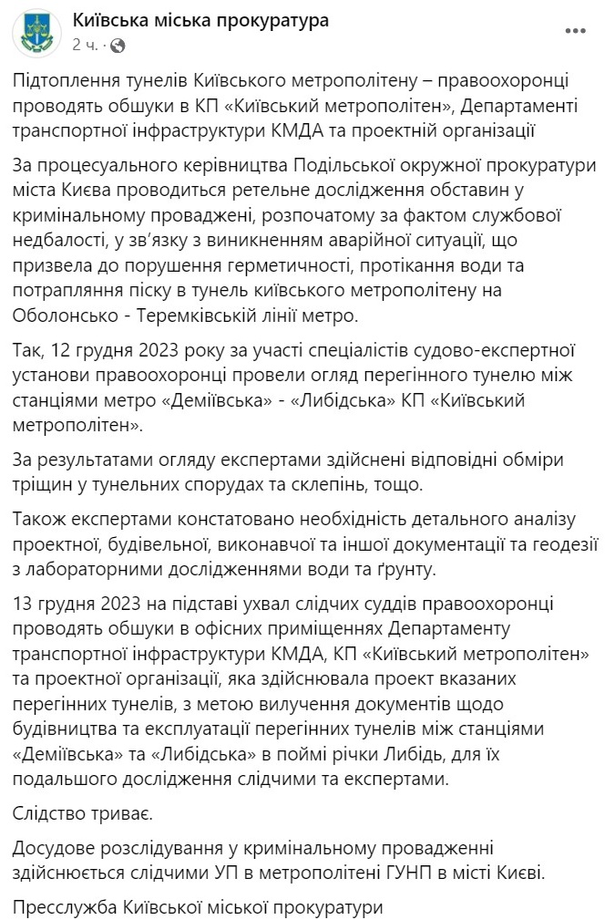 Обыски по делу о затоплении тоннеля киевского метро проходят в КП "Киевский метрополитен", Департаменте транспортной инфраструктуры КГГА и проектной организации.