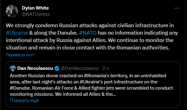 "НАТО не располагает информацией, указывающей на какие-либо намеренные атаки России против союзников. Мы продолжаем следить за ситуацией и находимся в тесном контакте с румынскими властями", - добавил Уайт.