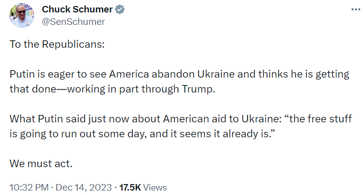 Ранее Чак Шумер упрекнул республиканцев в Конгрессе в том, что рождественские каникулы для них важнее, чем работа над разрешением кризиса на границе США и помощь Украине.