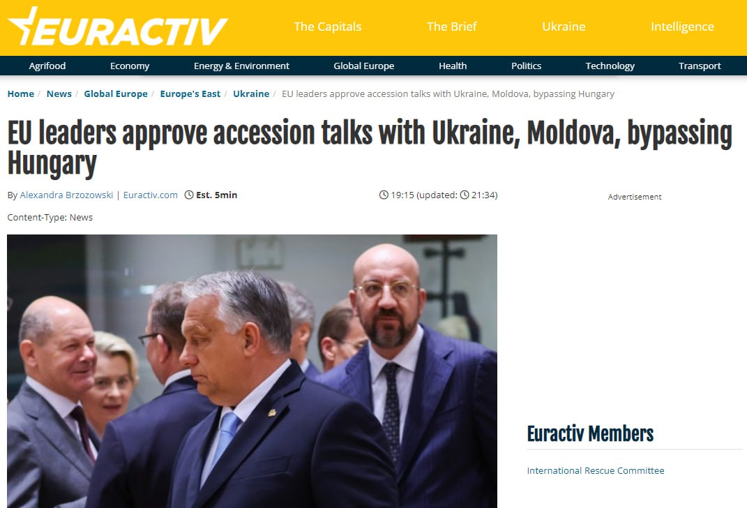 Неделю назад премьер-министр Венгрии говорил, что лидеры Евросоюза "должны воздержаться от обсуждения вопроса вступления Украины в ЕС во время декабрьского заседания Европейского совета, поскольку среди стран-членов нет единства по этому вопросу".