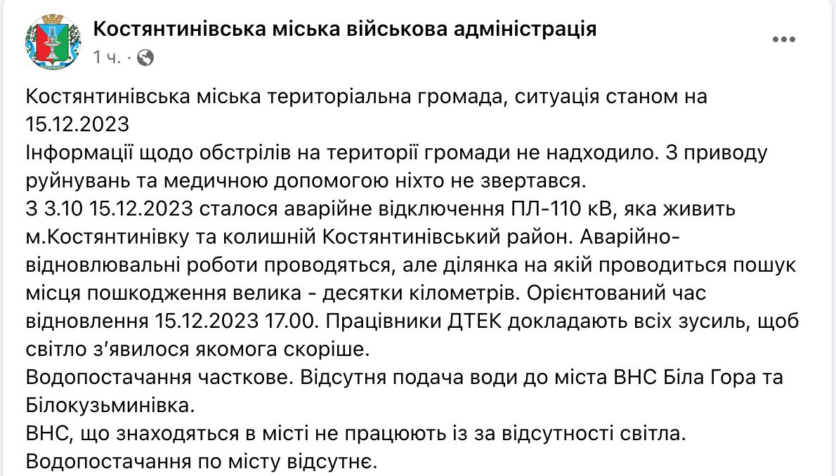 Константиновка в Донецкой области осталась без света и воды. Ищут место повреждения