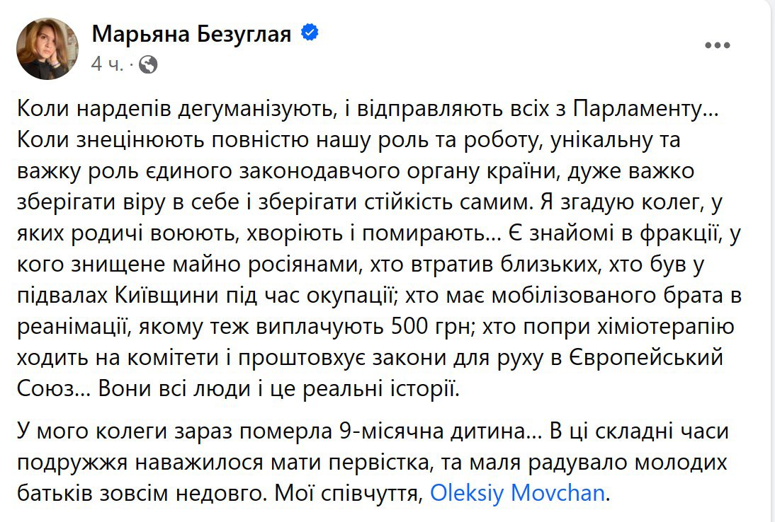Безуглая написала соболезнование нардепу Алексею Мовчану, у которого на днях умер девятимесячный сын. При этом она начала пост с критики в адрес тех, кто "дегуманизирует" и "обесценивает" народных депутатов, указав, что они тоже переживают разные жизненные невзгоды.