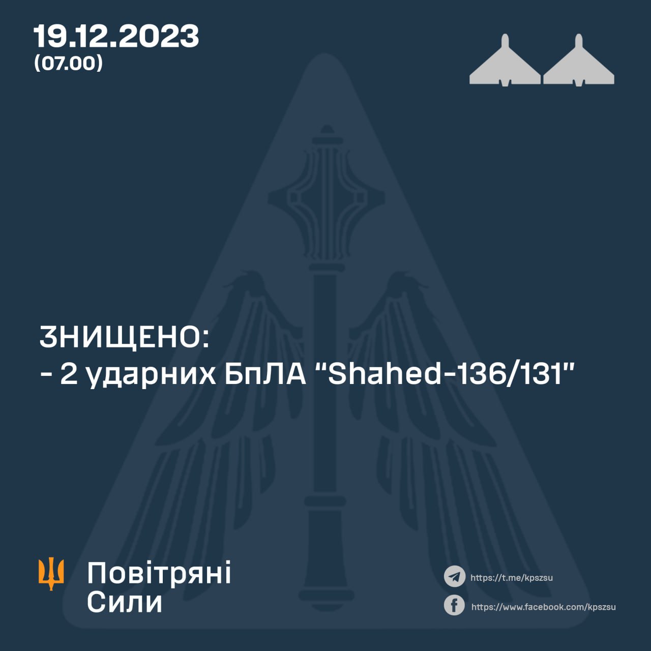 07.45 Ночью 19 декабря во время атаки рф в Хмельницкой области уничтожены два "Шахеда" из двух.