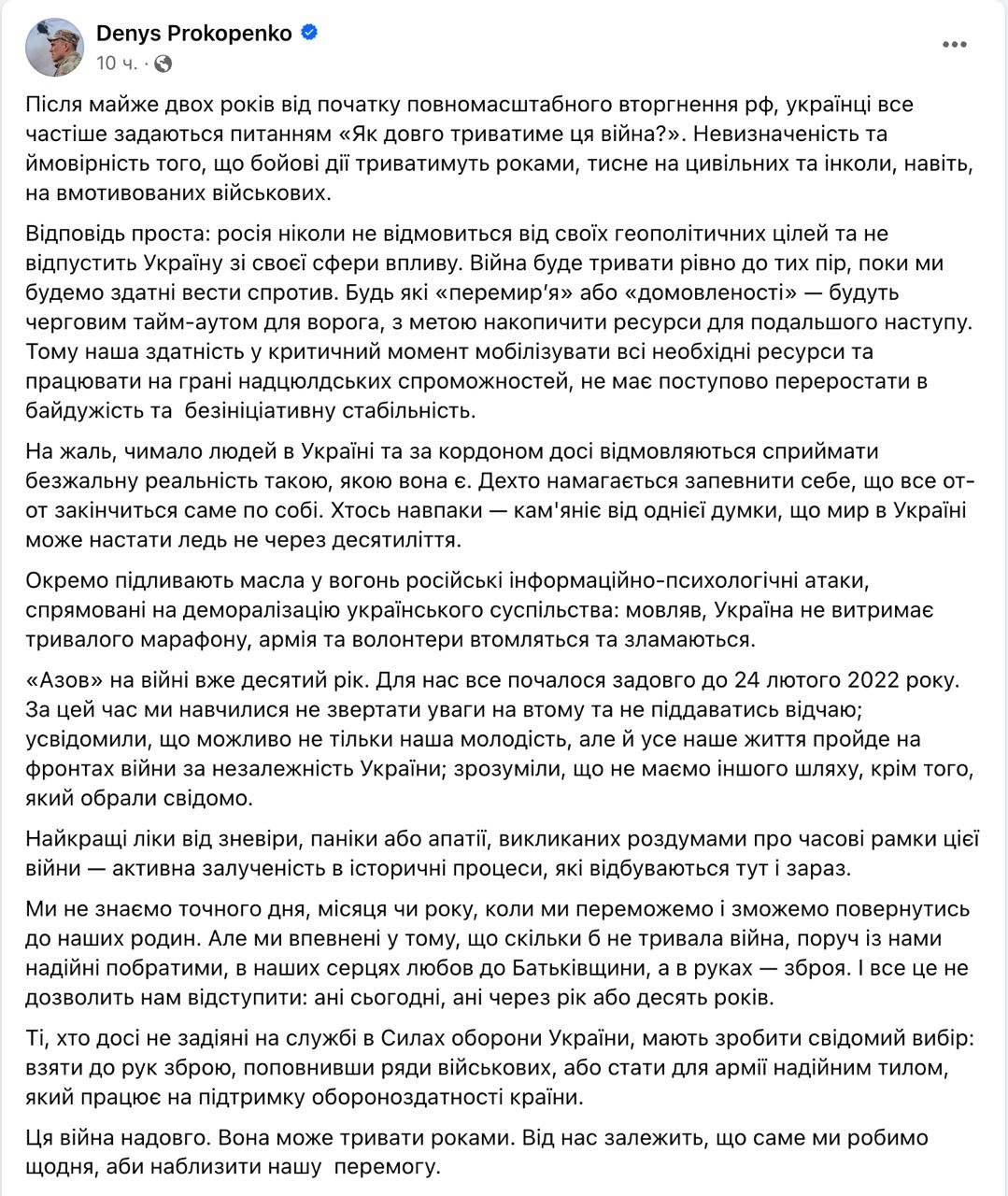 10.58 Война в Украине будет долгой, считает командир "Азова" Денис "Редис" Прокопенко.