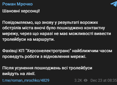 "Сообщаем, что снова в результате вражеских обстрелов города ночью была повреждена контактная сеть, из-за чего пока нет возможности вывести троллейбусы на маршруты. Специалисты КП "Херсонэлектротранс" в ближайшее время проведут работы по восстановлению сети", - сообщил Мрочко