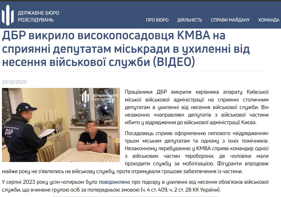 Государственное бюро расследований сообщило о подозрении высокопоставленному чиновнику Киевской городской военной администрации за содействие депутатам Киевсовета в уклонении от несения военной службы.