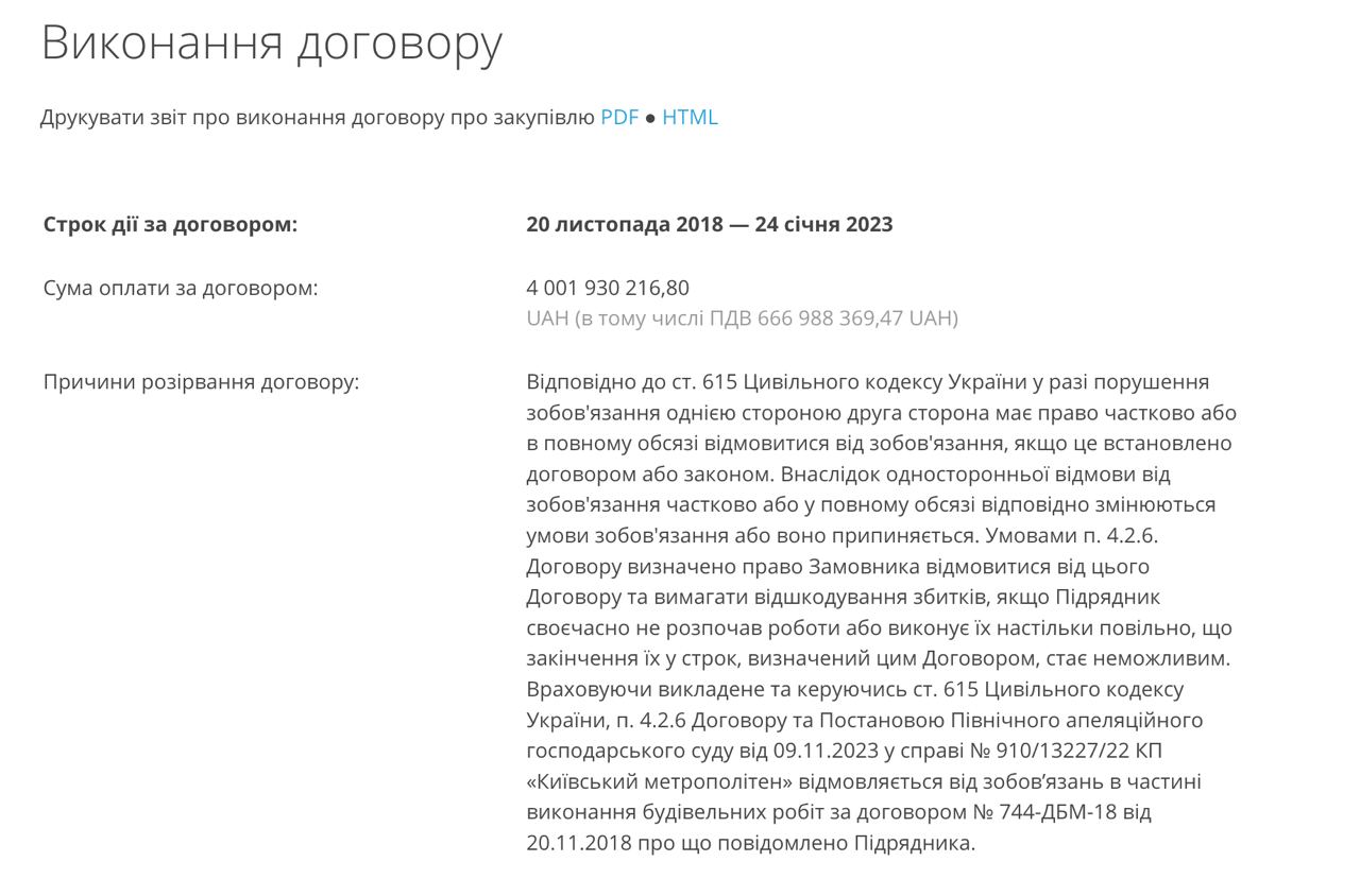 Согласно тексту на сайте, условиями договора было предусмотрено право заказчика отказаться от сделки и требовать возмещения убытков, если подрядчик не успевает выполнить работу вовремя. Теперь "Киевметрострой" должен вернуть переданные ему заказчиком деньги.