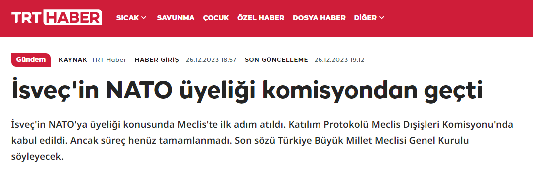 Во вторник, 26 декабря комиссия по международным делам парламента Турции утвердила ратификационный протокол о вступлении Швеции в состав НАТО.