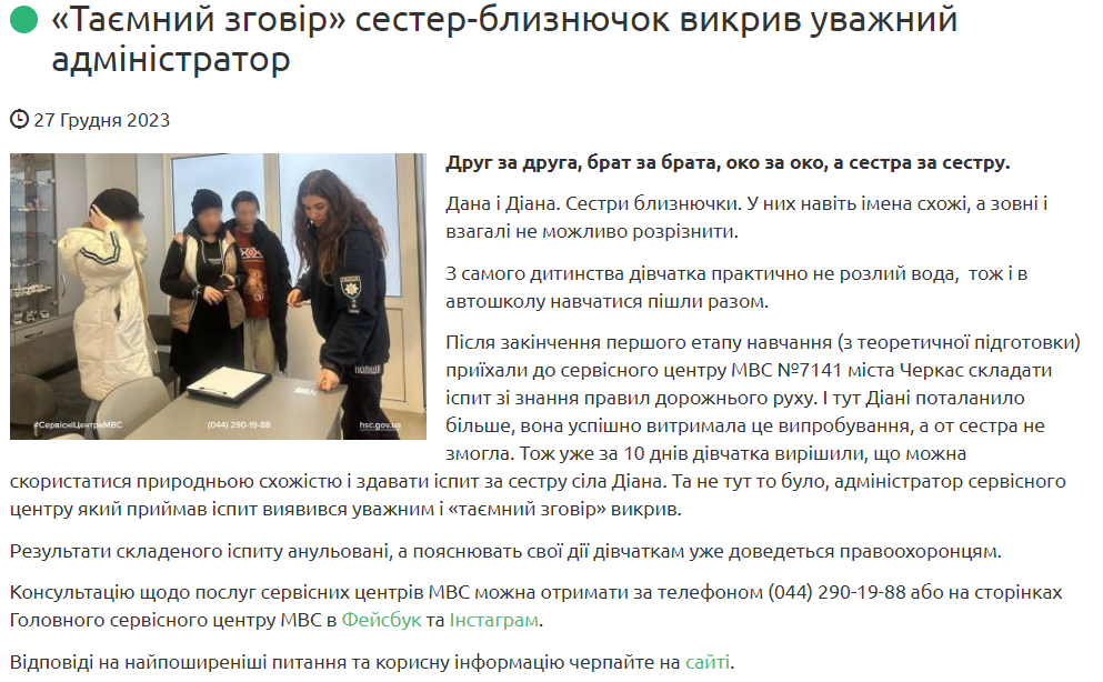 В Черкассах разоблачили девушку, которая пришла сдавать экзамен на права за свою сестру-близняшку
