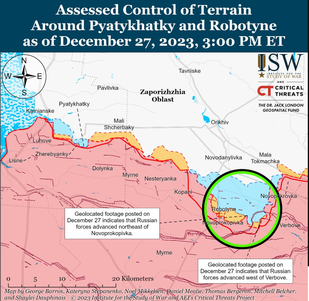 Институт связывает это с тем, что "украинские войска отошли зимой на более защищенные позиции возле Работино". Аналитики ссылаются на кадры с геолокацией, опубликованные 14 и 27 декабря. Они показывают, что российские войска продвинулись к западу от Вербового.