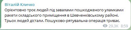 Также он сообщил, что ориентировочно три человека могут находиться под завалами поврежденного обломками ракеты складского помещения в Шевченковском районе. Трех человек достали. Поисково-спасательная операция продолжается.