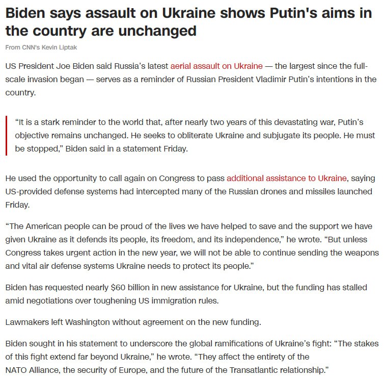 "Если Конгресс не примет срочных мер в новом году, мы не сможем продолжать отправлять оружие и системы ПВО, необходимые Украине. Ставки этой борьбы выходят далеко за пределы Украины. Они влияют на весь НАТО, безопасность Европы и будущее трансатлантических отношений", – написал Байден.