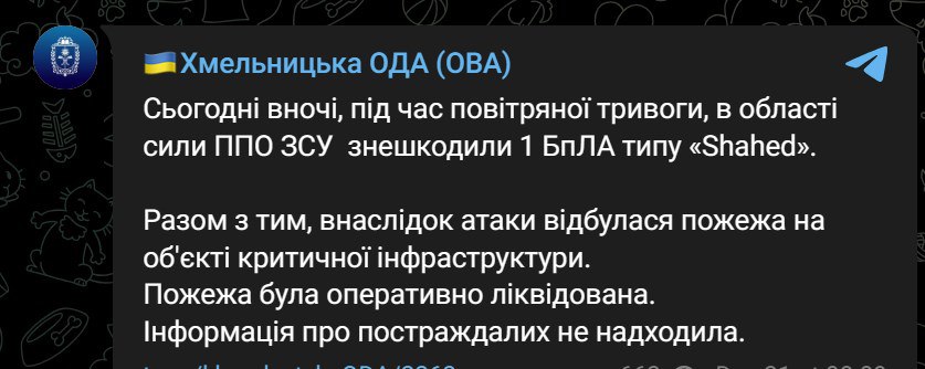 "Сегодня ночью во время воздушной тревоги в области силы ПВО ВСУ обезвредили 1 БПЛА типа "Shahed". В то же время в результате атаки произошел пожар на объекте критической инфраструктуры" - говорится в сообщении.