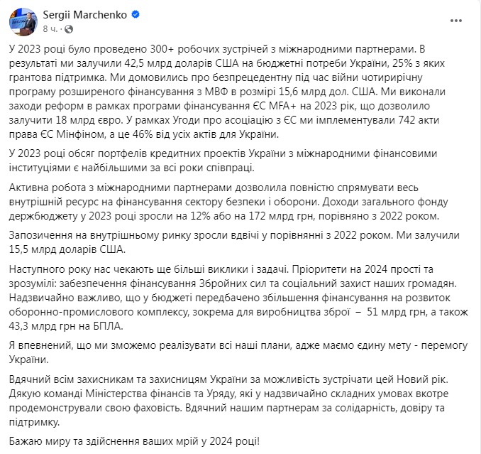 "В 2023 году было проведено 300+ рабочих встреч с международными партнерами. В результате мы привлекли 42,5 млрд долларов США на бюджетные нужды Украины, 25% из которых - грантовая поддержка. Мы договорились о беспрецедентной во время войны четырехлетней программе расширенного финансирования с МВФ в размере 15,6 млрд дол. США. Мы выполнили реформы в рамках программы финансирования ЕС MFA+ на 2023 год, что позволило привлечь 18 млрд евро. В рамках Соглашения об ассоциации с ЕС мы имплементировали 742 акта права ЕС Минфином, а это 46% всех актов для Украины", - сказано в записи.