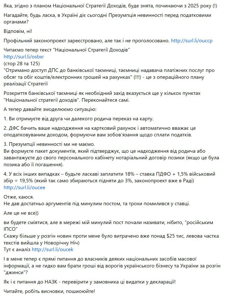 "Которая, согласно плану Национальной стратегии доходов, будет снята, начиная с 2025 года", - пишет Амелин на своей странице в Фейсбуке.